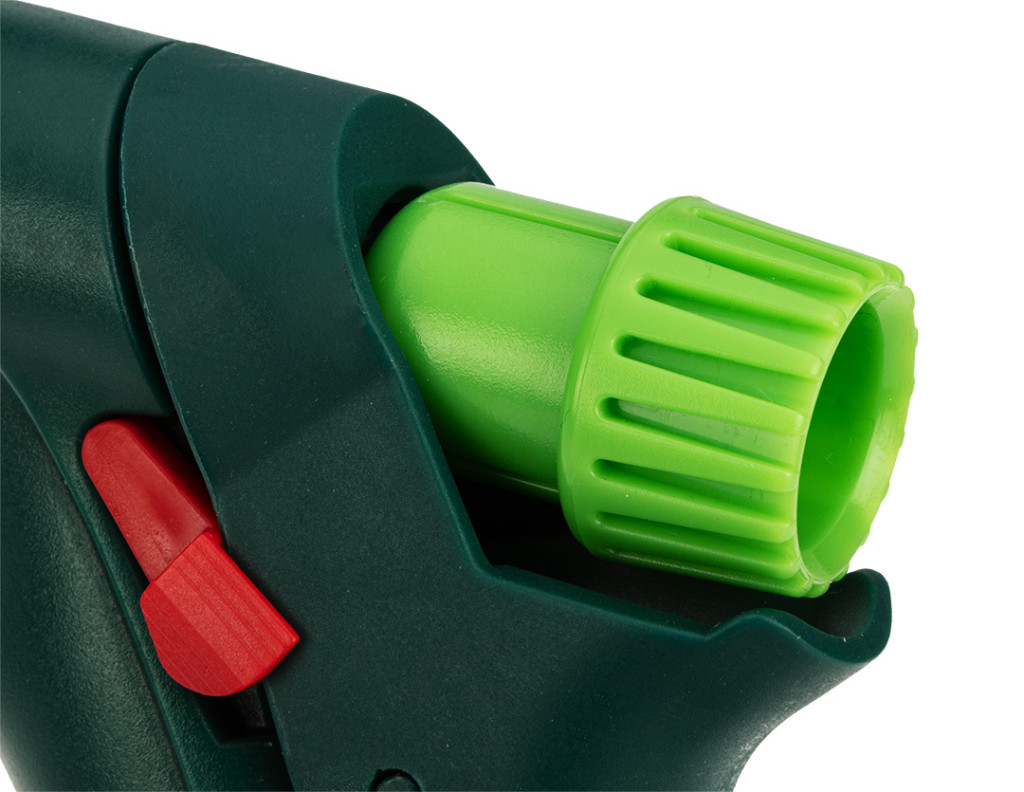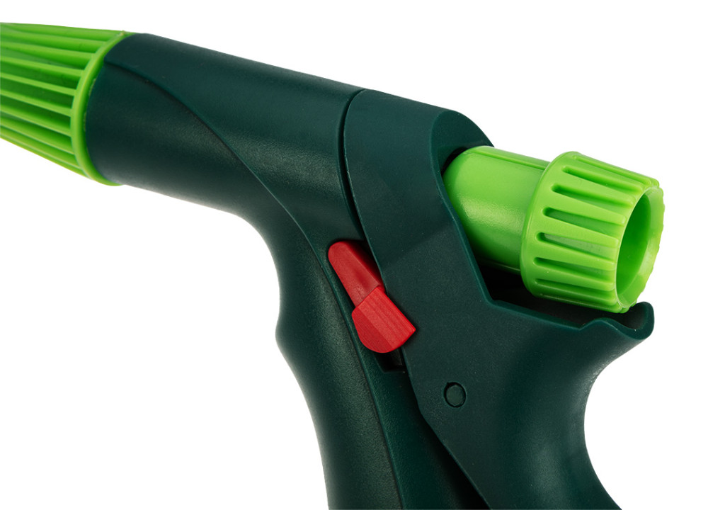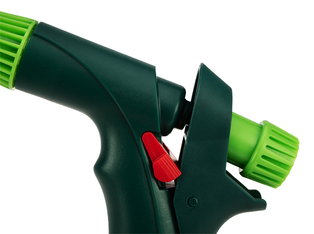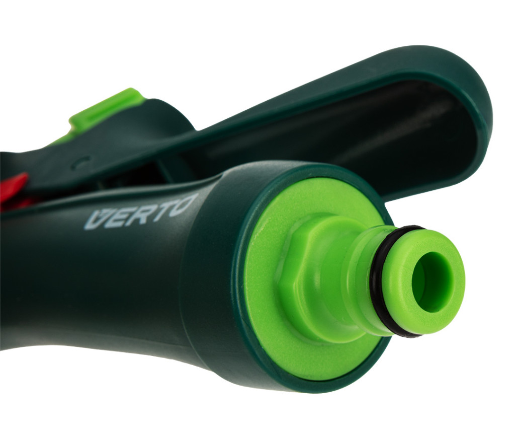 VERTO 15G716 öntözőpisztoly. a pisztoly egy gombbal rendelkezik, amellyel a vízsugár alakja a ködtől az erős pontszerű permetezésig állítható. A pisztoly hátsó reteszelő karral is rendelkezik, így folyamatos üzemmódban is működhet. Az ergonomikusan kialakított fogantyú jól illeszkedik a kézbe és nem csúszik, növelve a kényelmet. Tartós ABS műanyagból készült.