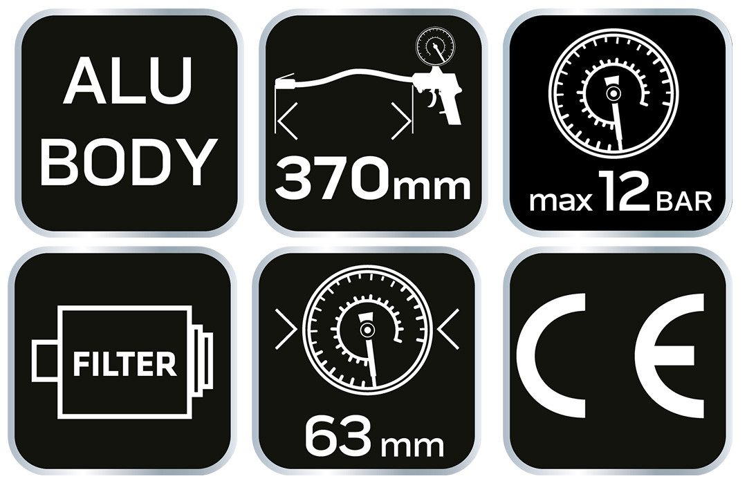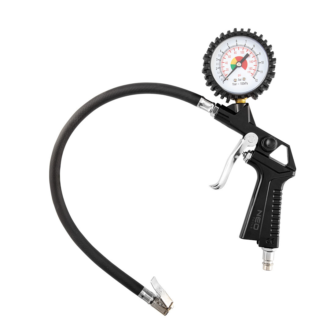 Gumiabroncs felfújó pisztoly nyomásmérővel, 14-714, NEO TOOLS - alumínium. A maximális üzemi nyomás 12 bar. Az eszközt praktikus akasztóval és 300 mm hosszú tömlővel látták el. Egy kézzel is kezelhető (fújás és leeresztés). A kiváló minőséget CE tanúsítvány igazolja. A NEO márka a professzionális igényeket is kielégíti.