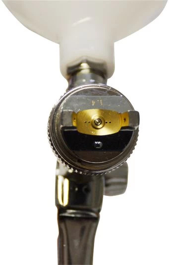 • HVLP= High Volume Low Pressure, azaz nagy teljesítmény alacsony nyomáson • Műanyag áramlási csésze • Legfinomabb porlasztás nagy területteljesítmény mellett • Fúvóka 1,4 mm • Csatlakozócsonk Műszaki adatok Csatlakozó menet: IG 1/4 " Üzemi nyomás: 3 - 6 bar Levegőigény: 160 - 300 l/min Tartalom: 600 ml Fúvóka mérete: 1,4 mm Hosszúság: 335 mm Széles: 201 mm Magasság: 100 mm Logisztikai adatok Csomagolási méretek Hosszúság 230 mm Széles 150 mm Magasság 130 mm Nettó súly: 0,64 kg Bruttó tömeg: 1,01 kg GTIN: 4015671401304 Cikkszám: 40130