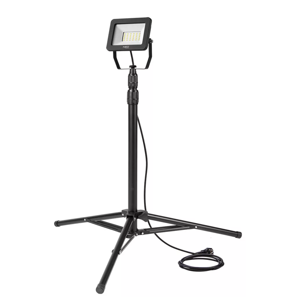 Reflektor, állványos, SMD LED, 230V/50W, 99-060, NEO - beltéri és kültéri világításhoz egyaránt használható. Elsősorban felújítási és építési munkákhoz ajánlott, amikor fontosak a jó látási viszonyok és nem áll rendelkezésre más fényforrás. Hasznos lehet a műhelyben, fotóstúdióban, padláson vagy az alagsorban is, de kívül is jól jöhet, amikor egy járművet, a teraszt vagy a ház bejáratát kell megvilágítani. Ami lényeges, hogy a reflektor teleszkópos állványra van felszerelve. Az állvány maximális magassága 180 cm. A lámpa világítási szöge akár 120o is lehet. A világítás iránya állítható.