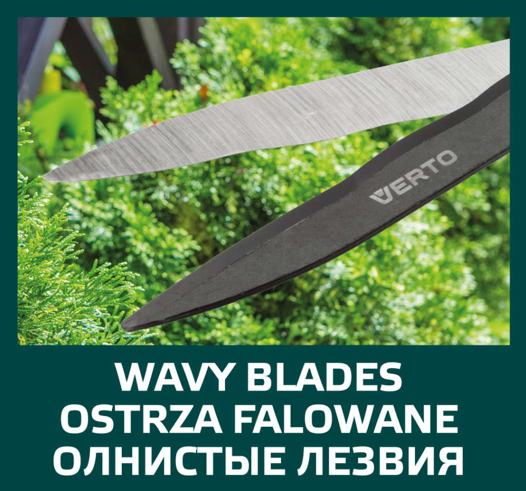 A VERTO 15G311 hullámos sövényvágó olló ideális választás lehet sövények rendben tartásához és formázásához. A hullámos élek különleges kialakítása lehetővé teszi, hogy precíz és dekoratív vágásokat hozzon létre a sövényeken, amelyekkel egyedi megjelenést kölcsönözhet kertjének. Az olló hossza 550 mm, míg az éle hossza 200 mm, ami lehetővé teszi a hatékony és precíz vágást a sövények formázásakor. A teflon bevonattal ellátott hullámos élek védik az eszközt a korróziótól, ami hosszabb élettartamot biztosít. Az ergonomikusan kialakított gumírozott markolat tökéletesen illeszkedik a kézbe, és biztosítja a stabil fogást. A gumírozott felület csökkenti a csúszást, így biztonságosabbá és kényelmesebbé teszi a munkavégzést. Összességében a VERTO 15G311 hullámos sövényvágó olló egy megbízható és hatékony eszköz a kerti munkákhoz, amely segít abban, hogy sövényei ápoltak és rendezettek legyenek, minimális erőbefektetéssel., ,,