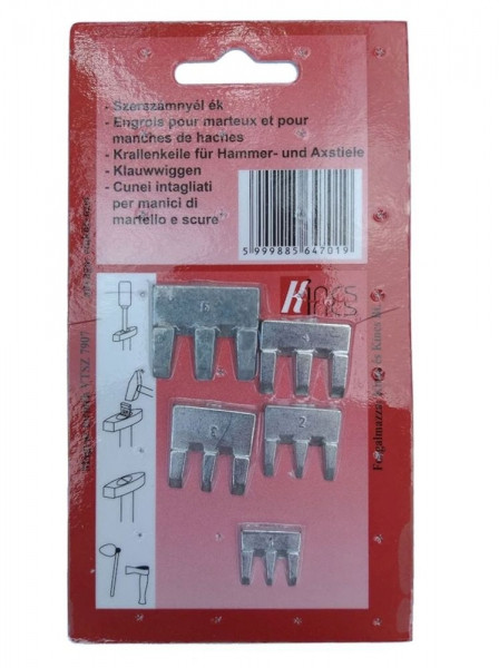 Szerszámnyél ék, 5 darab, lapos. Méretei:.1×1,5cm, 2×1,8cm, 2,2×2,2cm, 2,3×1,9cm, 2,3×2,4cm. Ajánlott kalapács, balta, kapa és egyéb szerszámok nyeleinek gyors rögzítéséhez.