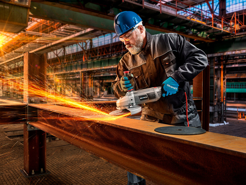 GRAPHITE sarokcsiszoló, 230mm 2350 W, lágy indítás, elforgatható markolat. Nagy teljesítményű gép,különféle keménységű és szerkezetű anyagok vágására, csiszolására és polírozására szolgál. A fej maximális fordulatszáma 6000/ perc⁻¹. A tárcsa átmérője 230 mm. A szerszám ergonómikus formakialakításának (igen keskeny felépítés) és precíz kiegyesúlyozásának köszönhetően nagyon komfortossá teszi a munkavégzést - még egy kézzel is. A sarokcsiszoló felépítése olyan, hogy a tárcsa oldalsó védőborításának szöge könnyen megváltoztatható. A biztonságot szem előtt tartva a sarokcsiszoló kétfokozatú, a véletlen elindítást kizáró indítógombot, valamint a szerszám házából nem kiálló orsóreteszelő gombot kapott. A szellőzőnyílások megfelelő elosztása megakadályozva a motor túlmelegedését. Az oldalmarkolat két helyzetben is felszerelhető. Ezen felül a sarokcsiszoló hosszú, rugalmas, masszív gumiborítású hálózati csatlakozókábellel van felszerelve. A CE tanúsítvány bizonyítja az európai szabványoknak való megfelelést.