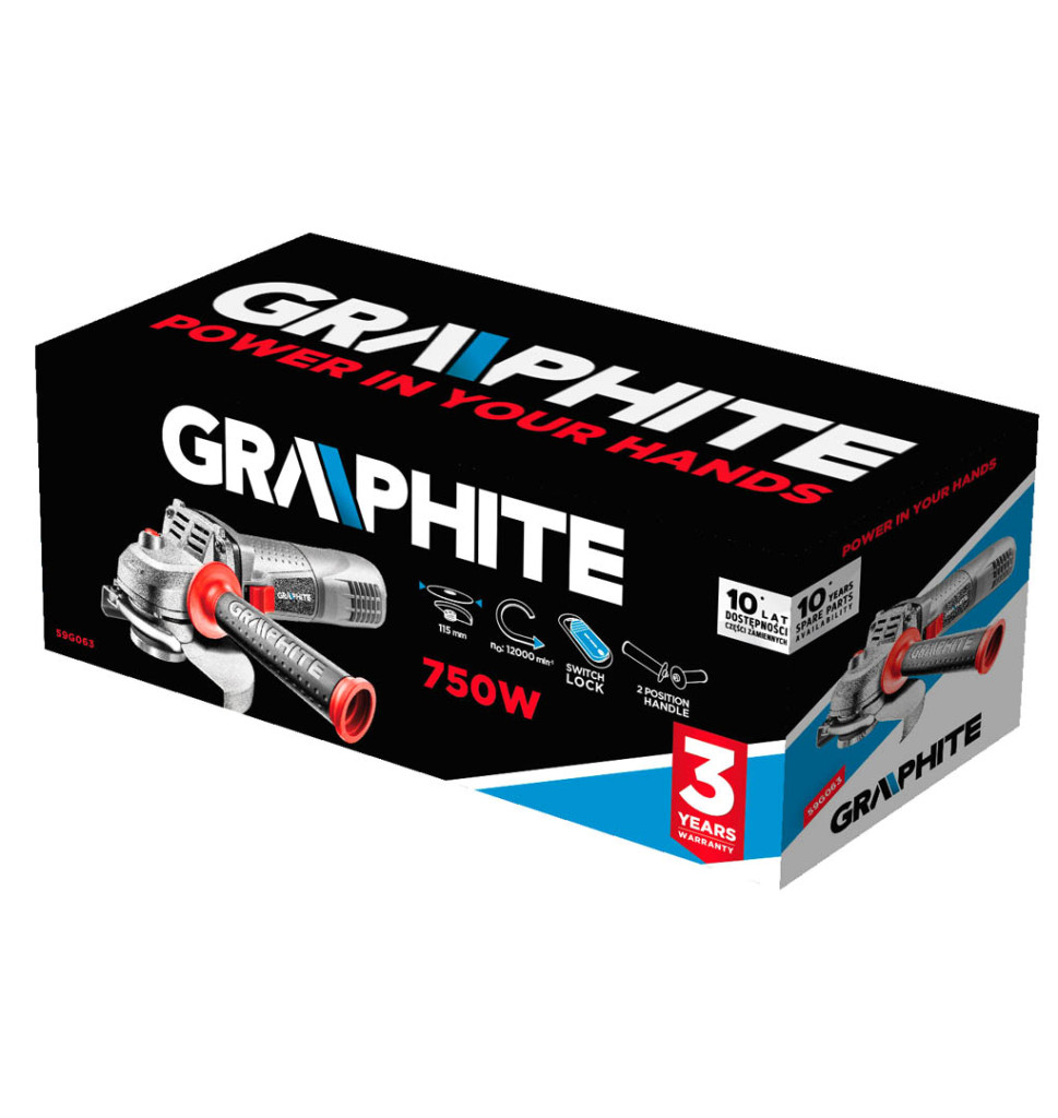 GRAPHITE sarokcsiszoló, 115mm750 W. Különféle keménységű és szerkezetű anyagok vágására, csiszolására és polírozására szolgál. A fej maximális fordulatszáma 12 000 perc⁻¹. A tárcsa átmérője 115 mm. A szerszám ergonómikus formakialakításának (igen keskeny felépítés) és precíz kiegyesúlyozásának köszönhetően nagyon komfortossá teszi a munkavégzést - még egy kézzel is. A sarokcsiszoló felépítése olyan, hogy a tárcsa oldalsó védőborításának szöge könnyen megváltoztatható. A biztonságot szem előtt tartva a sarokcsiszoló kétfokozatú, a véletlen elindítást kizáró indítógombot, valamint a szerszám házából nem kiálló orsóreteszelő gombot kapott. A szellőzőnyílások megfelelő elosztása megakadályozva a motor túlmelegedését. Az oldalmarkolat két helyzetben is felszerelhető. Ezen felül a sarokcsiszoló hosszú, rugalmas, masszív gumiborítású hálózati csatlakozókábellel van felszerelve. A CE tanúsítvány bizonyítja az európai szabványoknak való megfelelést.