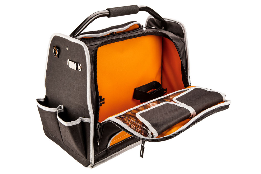 Szerszámtáska csőalakú fém fogantyúval, kívül 12 zseb, belül 32 zseb