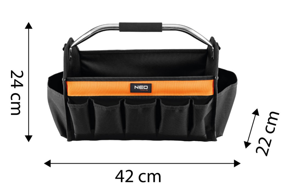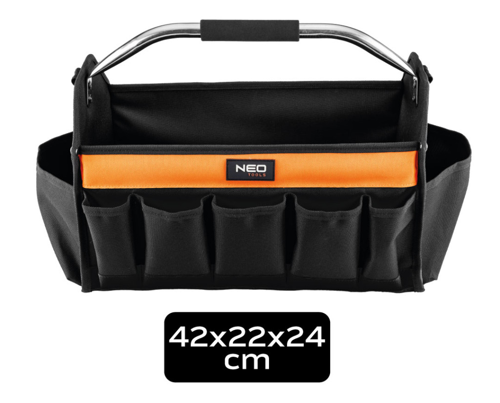 Szerszámtáska csőalakú fém fogantyúval, vállpánttal, 12 zseb, 42x22x24cm, NEO TOOLS