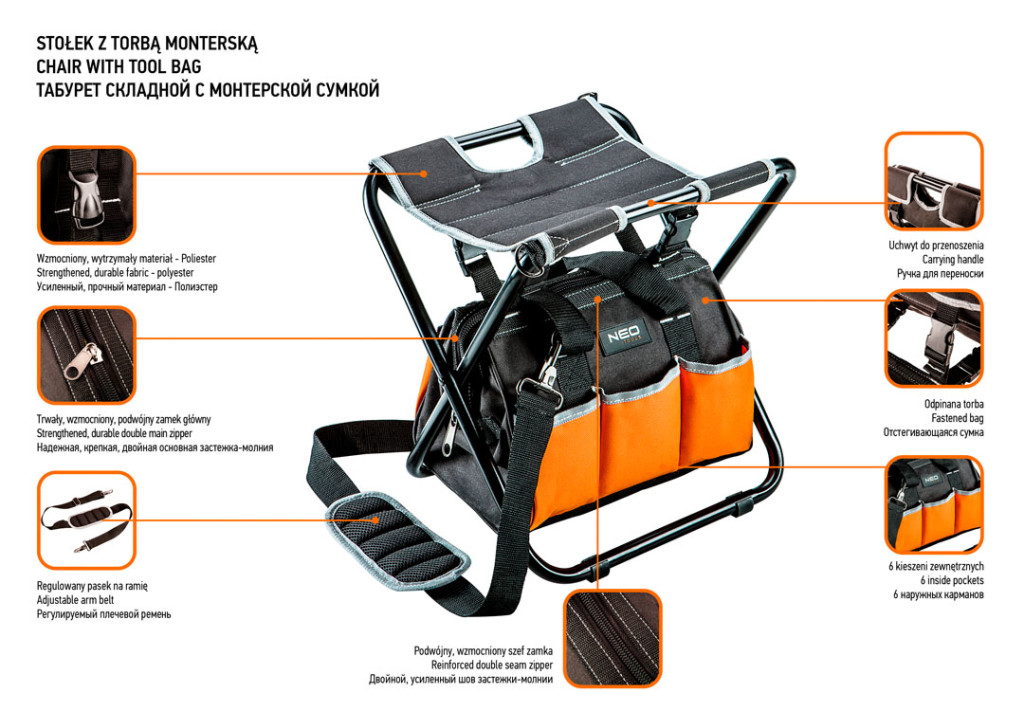 A NEO szerszámtartó szék (kat.sz.: 84-306) kiváló minőségű 600D poliamid szövetből készül, ami hosszú élettartamot garantál. A székhez csatolt szerszámtartó táska lehetővé teszi a legnehezebb körülmények között végzendő munkákhoz való alkalmazkodást. Állítható vállpántjának és hordfogantyújának köszönhetően kényelmesen szállítható. A székre rögzített táska rendelkezik egy fő rekesz és 6 külső zseb kombinációjával, amelyek ideálisak a szerszámok tárolásához. A NEO márka ezzel a termékkel is a professzionális igények kielégítésére törekszik.