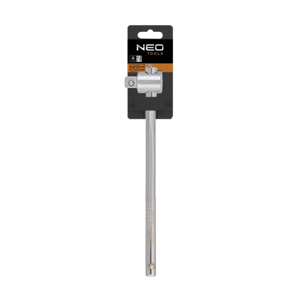 NEO 250 mm-es, 1/2"-os hajtókar. Minden műhelyben hasznos, funkcionális szerszám. Nagy ellenállóképességű króm-vanádium acélból készül, a DIN 3123 szabványnak megfelelően. A szerszám minőségét bizonyítja a TÜV tanúsítvány és a gyártó által nyújtott 25 éves jótállás. A NEO márka a professzionális igényeket is kielégíti.