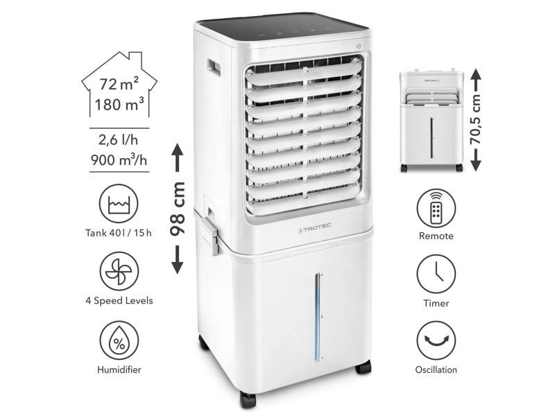 A léghűtők a klímaberendezésekkel ellentétben nem rendelkeznek kompresszoros hűtőrendszerrel, hanem a helyiség levegőjét a természetes levegő segítségével hűtik. A praktikusan összecsukható, távirányítóval ellátott TROTEC PAE 61 léghűtő friss levegőt és gyors hűtést biztosít a nyári hőségben, ráadásul egész évben használható télen párásítóként.