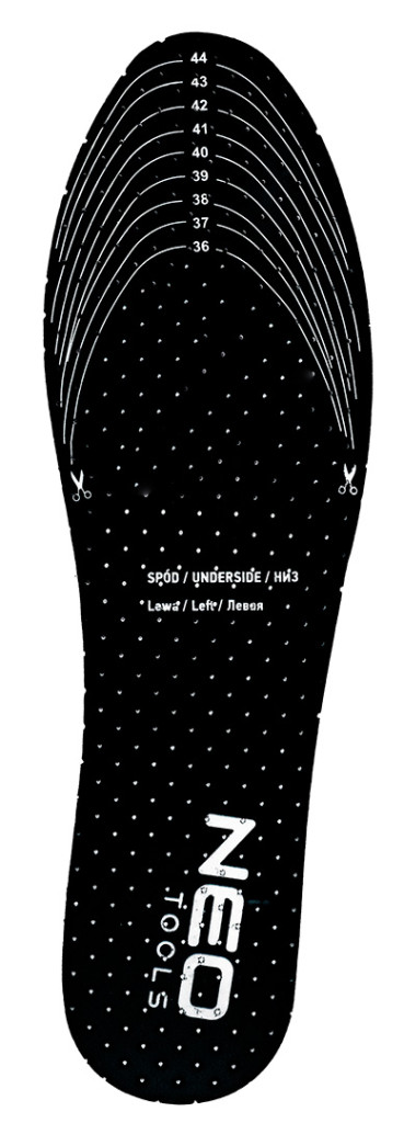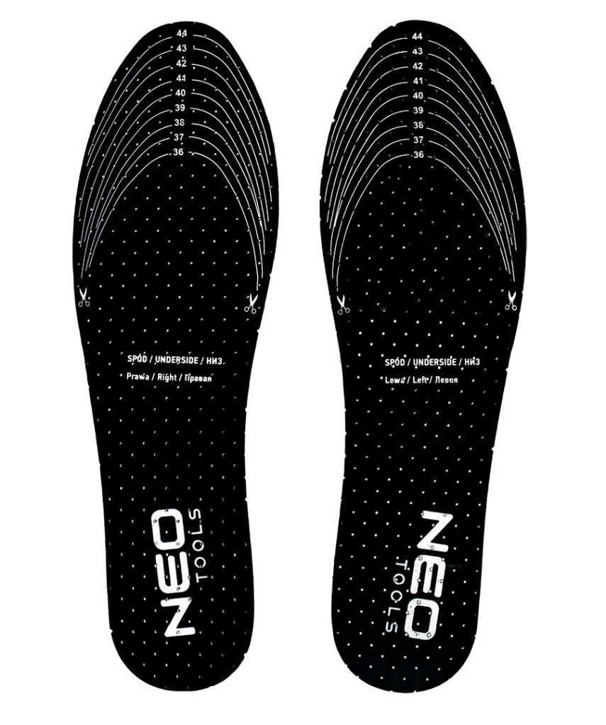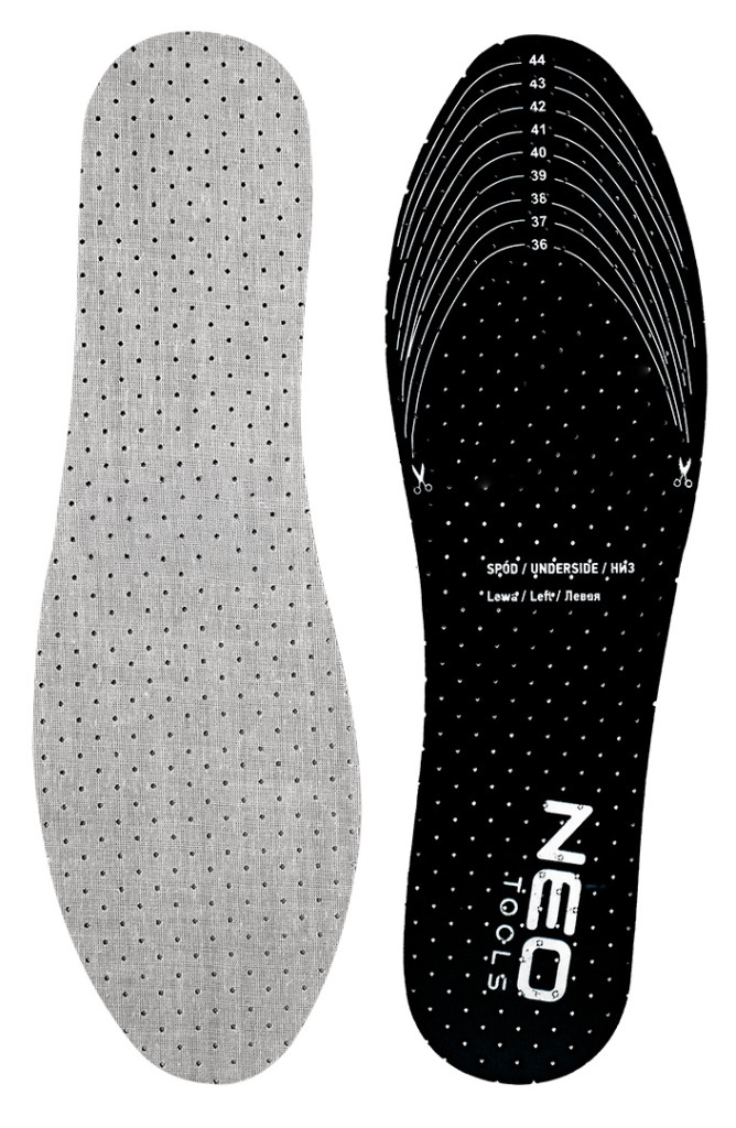 NEO 82-331 Talpbetét, antibakteriális, aktív szénnel, univerzális méret, 36-45. Különböző típusú lábbelikhez - munkához, túrázáshoz, valamint mindennapi használatra. Lehetővé teszi a 36 és 45 közötti méretre való beállítást. Latexhabból készül, megszünteti a kellemetlen szagokat, és a perforációknak köszönhetően jó szellőzést biztosít. A NEO TOOLS talpbetét méretvonalakkal rendelkezik az egyszerű vágáshoz. Kényelmesebbé teszi a lábbeli viselését - még egy dolgos nap során is.