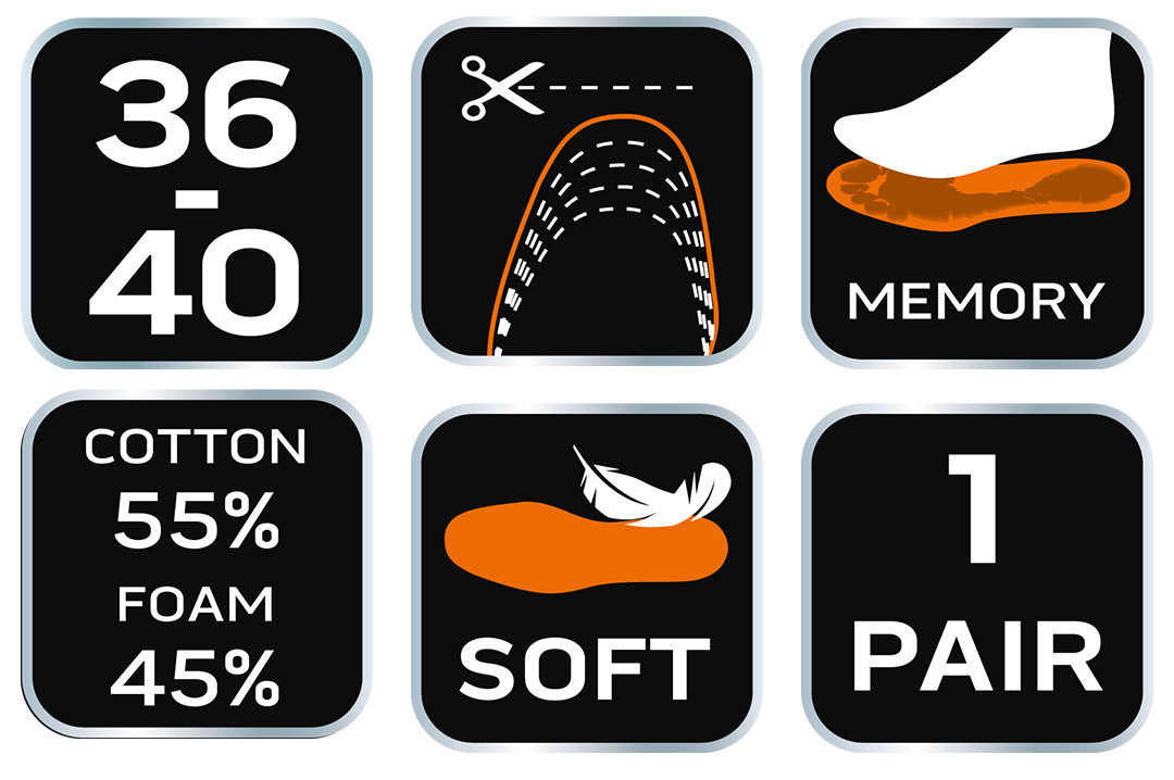 A NEO memóriahabos talpbetét 55 % pamut és 45 % poliészter textilbevonatból készül egy modern Memory habréteggel kiegészítve, amely tökéletesen alkalmazkodik a lábfej alakjához. Ellensúlyozza a tyúkszem kialakulását és támogatja a lábat. A NEO márkájú talpbetétek hozzájárulnak a lábbeli kényelméhez. 36-40-es méretere alkalmas, a kívánt méretre történő egyszerű vágással, Aktív emberek számára, biztonsági cipőkhöz és állómunkához kínált talpbetét.