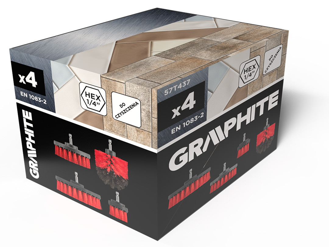 GRAPHITE 57T437 Tisztítókefekészlet fúró és csavarbehajtó gépekhez, 4db. Négy darab, 50 mm, 90 mm, 100 mm és 130 mm átmérőjű kefe, 1/4"-os hatszög szárral. A különböző fejkialakítások lehetővé teszik a különböző felületeken való munkát és a nehezen hozzáférhető területek elérését. Alkalmasak nedves vagy száraz tisztításhoz. A közepesen kemény sörték hatékonyan távolítják el a szennyeződéseket a felület károsítása nélkül. A GRAPHITE márkájú keféket barkács és ipari felhasználásra is ajánljuk.