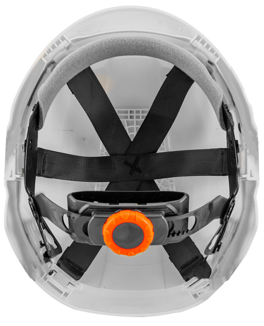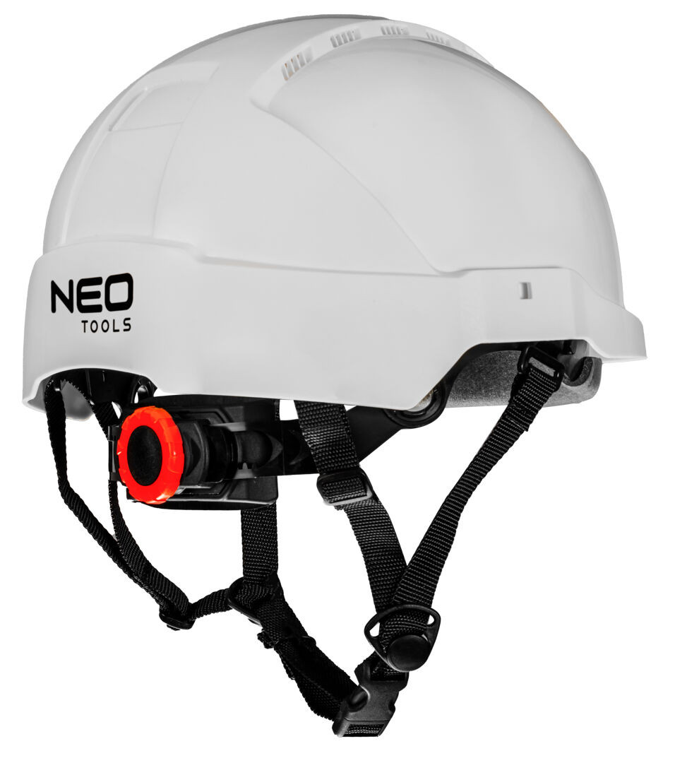 Ipari védősisak magaslati munkákhoz, fehér 97-211 NEO, lengyel gyártó nélkülözhetetlen fejvédője, különösen a magaslati munkákhoz, építőiparban, iparban és erdészetben végzett munkához rendeltetett.