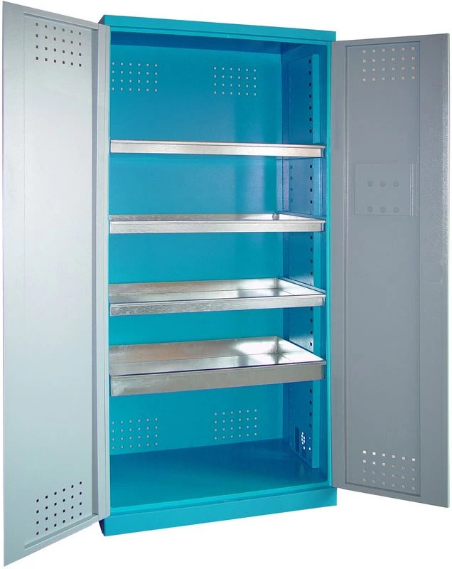 Cinktálcák száma: 3 darab|Cinktálcák szélessége: 845 mm|Cinktálcák magassága: 50 mm|Cinktálcák mélysége: 290 mm|A Cinktálcák teherbírása: 60 kg|Mélyített cinktálca száma: 1 darab|Mélyített cinktálca szélessége: 845 mm|Mélyített cinktálca magassága: 81,5 mm|Mélyített cinktálca mélysége: 290 mm|Kék szín RAL: 5015|Szürke RAL: 7035|Ajtók száma: 2 db|Ajtó szélessége: 920 x mm|Méretek WxDxH: 925 x 380 x 1,930 mm|Nettó súly: 89,1 kg|Bruttó súly: 93,6 kg
