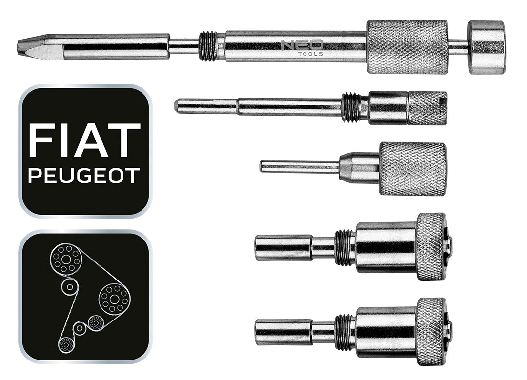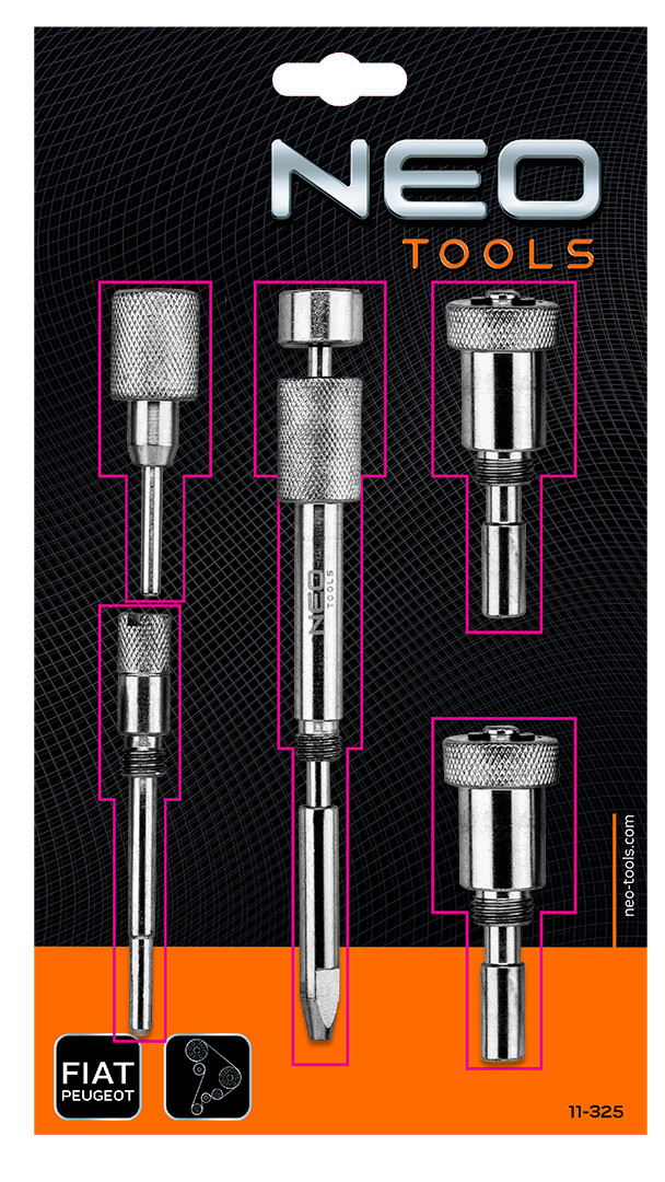 Vezérműtengely-blokkoló készlet Fiat/Peugeot dízelüzemű motorokhoz, 11-325, NEO TOOLS - vezérműtárcsa-blokkoló készlet kisteherautókhoz (furgonokhoz). A készlet dízelüzemű motorok vezérműtárcsájának blokkolására szolgáló elemeket tartalmaz. Biztosítja a motor beállításához és blokkolásához szükséges alapszerszámokat.