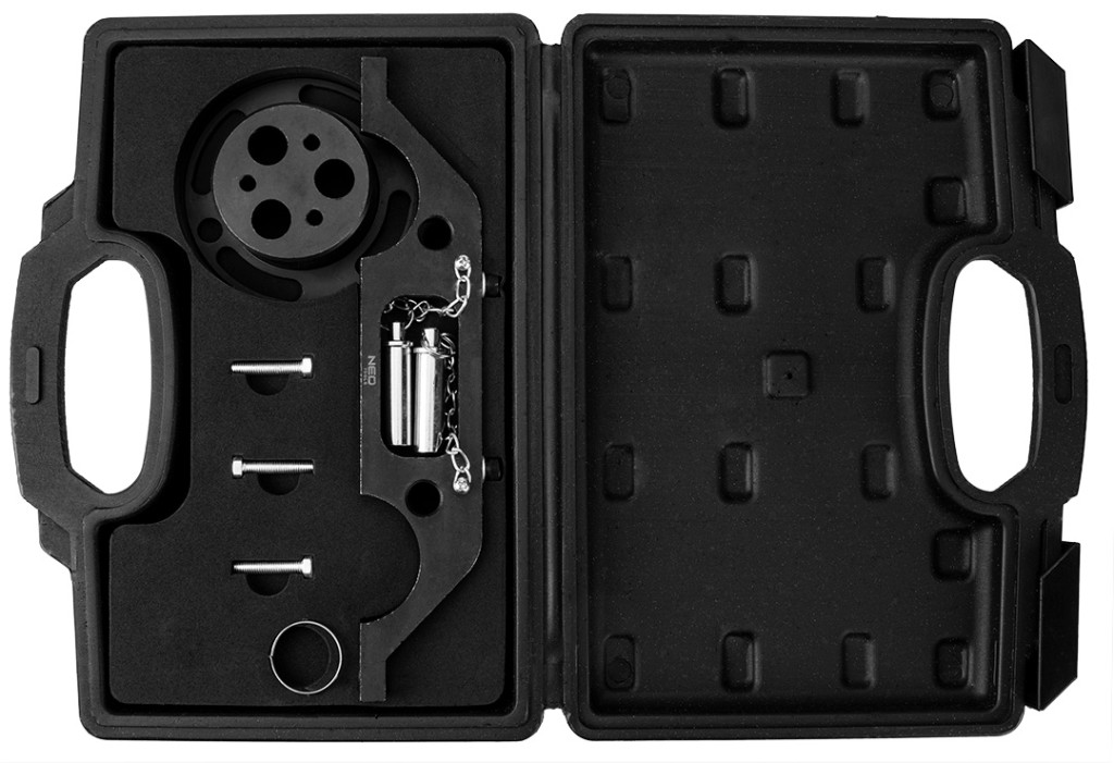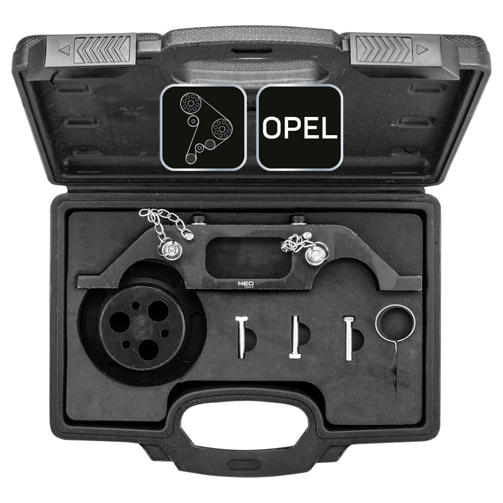 Vezérműtengely-blokkoló készlet Opel benzin- és dízelüzemű motorokhoz, 11-331, NEO TOOLS - vezérműtárcsa-blokkoló készlet Opel márkájú autókhoz. A készlet benzin- és dízelüzemű motorok vezérműtárcsájának blokkolására szolgáló elemeket tartalmaz. Biztosítja a motor beállításához és blokkolásához szükséges alapszerszámokat.