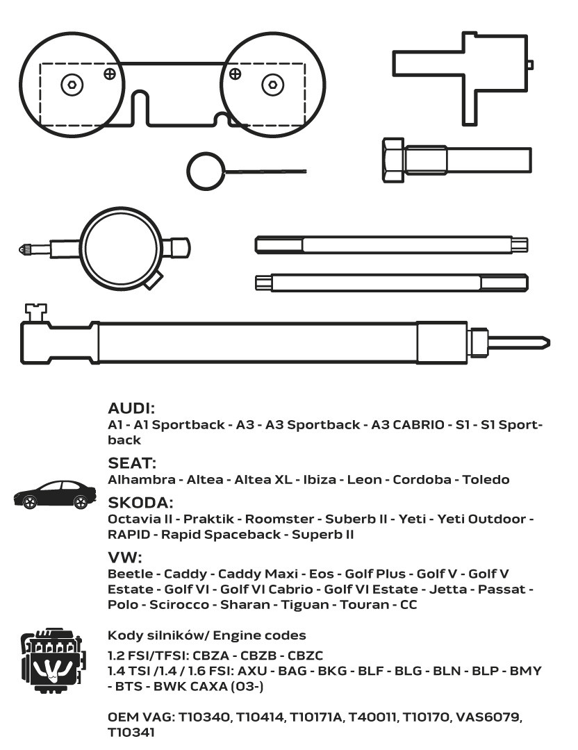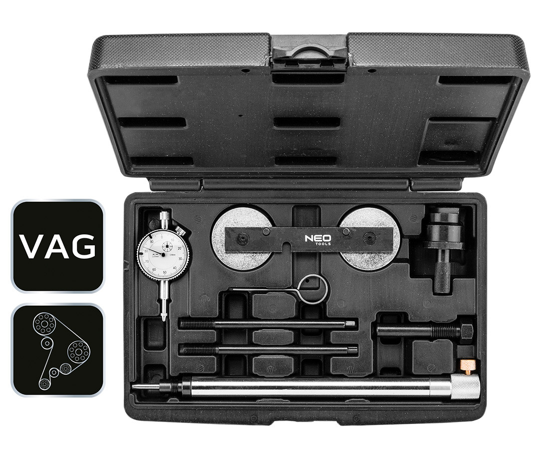 Vezérműtengely-blokkoló készlet VAG benzines motorokhoz, 11-307, NEO TOOLS - vezérműtárcsa-blokkoló készlet a VAG autóihoz. A készlet benzinüzemű motorok vezérműtárcsájának blokkolására szolgáló elemeket tartalmaz. Biztosítja a motor beállításához és blokkolásához szükséges alapszerszámokat.