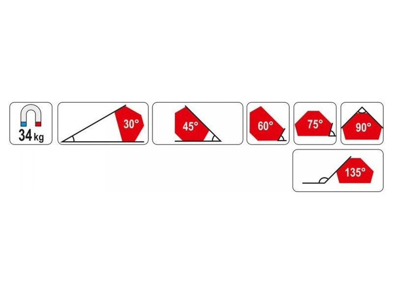 Hegesztő mágneses szögvas 111 x 136 x 24 mm A mágneses szögvas acéllemezből és erős ferrit mágnesekből készült. Lehetővé teszi az anyagok pontos összeillesztését a következő szögekben: 30°, 45°, 60°, 75°, 90° és 135° A mágneses szögvas használata lehetővé teszi, hogy szabadon dolgozzon mindkét kézzel, és tevékenységeket végezzen egy további személy segítsége nélkül. További információk: a mágnes emelőkapacitása kb. 34 kg porbevonatos felület ideiglenes fém elemek összeillesztésére tervezték hegesztés, fúrás, festés, mindkét kezünk használatát igénylő tevékenységek során Paraméterek: méret [mm]: 111x136x24 szög értékek [st:] 30°,45°,60°,75°,90°,135° terhelhetőség [kg]: 34 Cél / Alkalmazás: Lehetővé teszi a fém alkatrészek előzetes összeszerelését meghatározott szögekben. Használati figyelmeztetések: Figyelem! Mindig használj személyes védőfelszerelést a munka során.