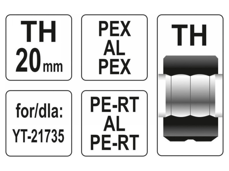 Kiegészítő TH-típusú szerelvény, mely a YT-21735 préshez lett tervezve. TH-típusú szerelvények összesajtolására használható 20mm méretben PEX csöveken. Használati figyelmeztetések: Figyelem! Munkavégzés során mindig használjon személyes védőfelszerelést.