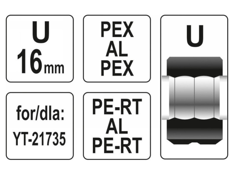 U-típusú tartalék mátrix, mely a YT-21735-ös préshez lett tervezve. PEX csöveken 16mm-es U-típusú szerelvények préselésére használatos. Használati figyelmeztetések: Figyelem! Mindig használjon személyes védőfelszerelést munka közben.