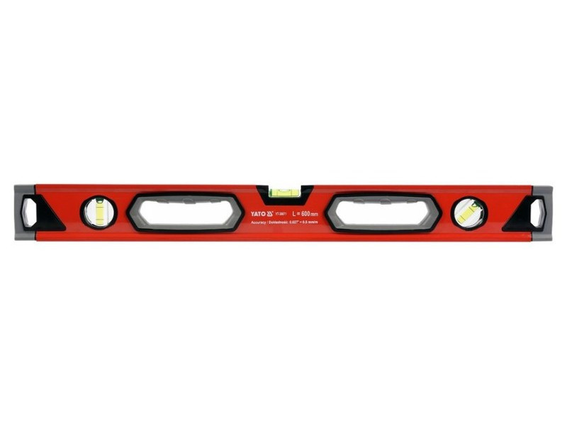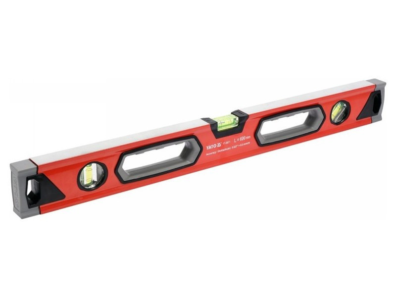 Alumínium szintező 600 mm, 3 libella, két fogantyú, 0,5 mm/m pontosság Stabil alumínium profilból készült Két precíziósan megmunkált mérőfelület Két rugalmas műanyagburkolatú fogantyú A végpárnák rugalmas műanyaggal vannak bevonva, hatékonyan védve a szintezőt az esetleges ütések hatásaitól Az oldalakat porfestékkel bevonott réteg védi A szintező megjelenítési pontossága 0,5 mm/m Libella: 3 akrilüvegből készült libella Láthatóságot növelő, sárga folyadékkal töltve Akrilüveg libellával töltve. Jelzi a függőleges, vízszintes és 45°-os szöget Ütéselnyelő műanyaggal szerelve Elérhető modellek: 60, 80, 100 és 120 cm.Professzionális építő és felújítási munkákhoz, mosógépek, hűtőszekrények, bútorok stb. pontos elhelyezéséhez.