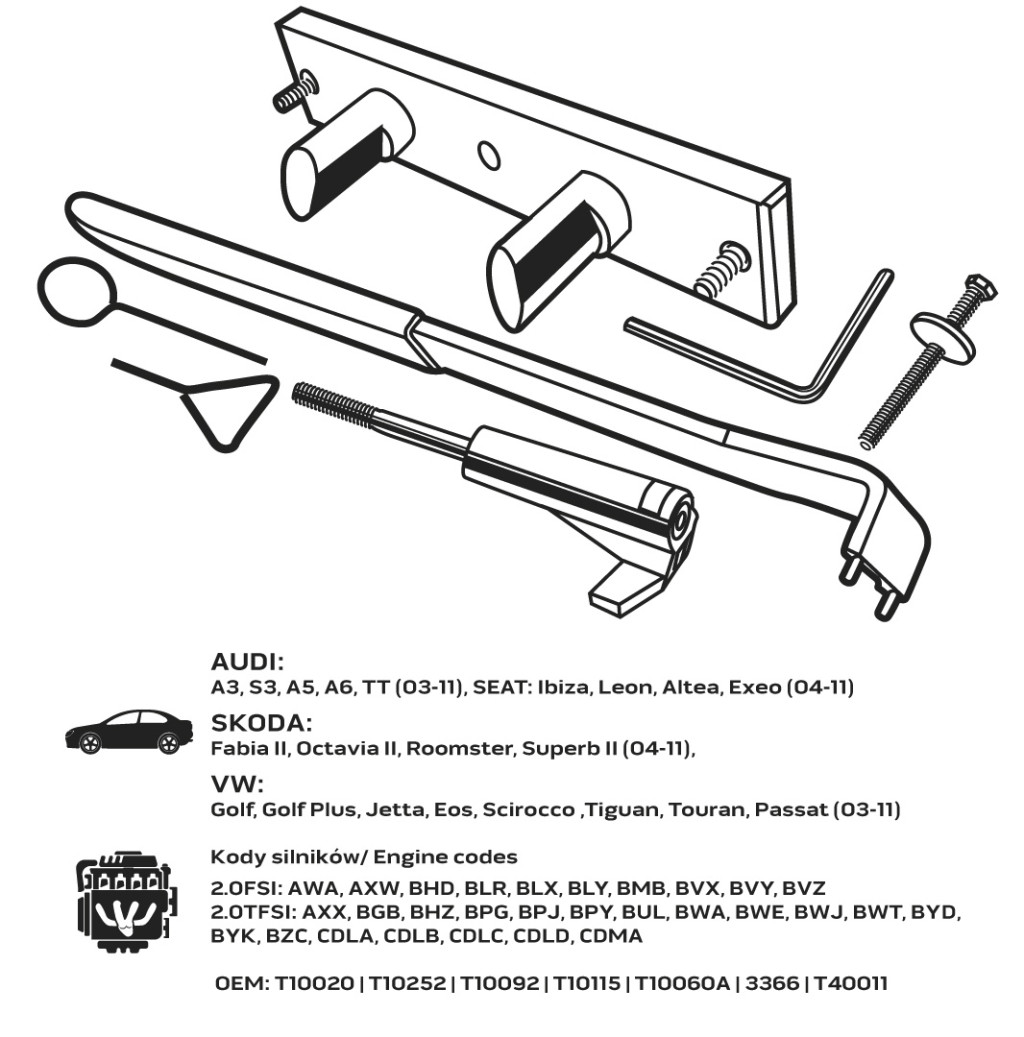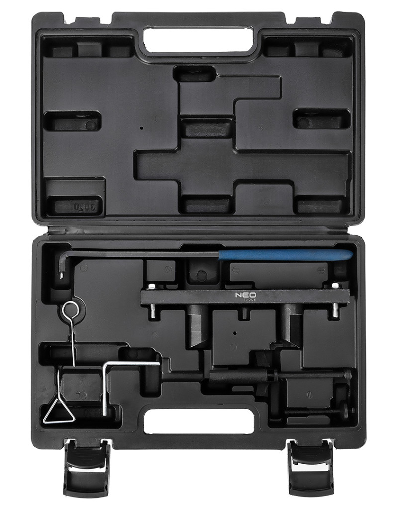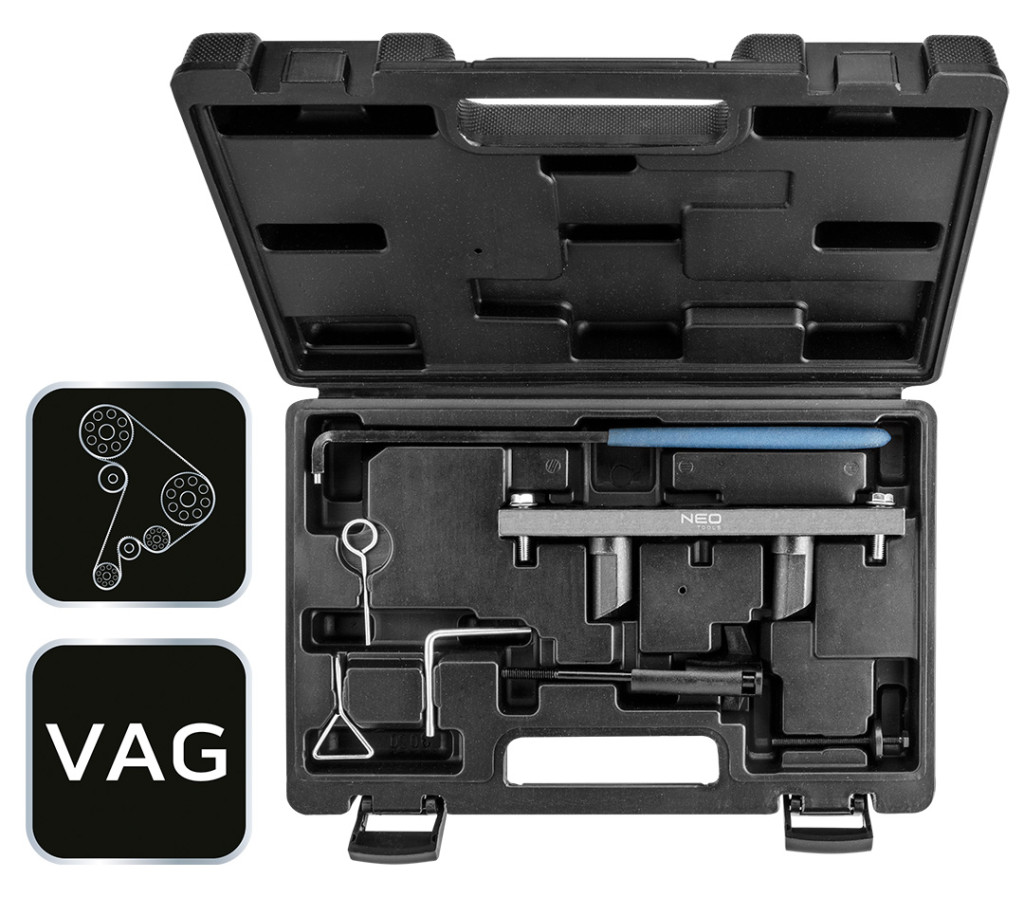 Vezérműtengely-blokkoló készlet VAG benzines motorokhoz, 11-306, NEO TOOLS - vezérműtárcsa-blokkoló készlet a VAG autóihoz. A készlet benzinüzemű motorok vezérműtárcsájának blokkolására szolgáló elemeket tartalmaz. Biztosítja a motor beállításához és blokkolásához szükséges alapszerszámokat.