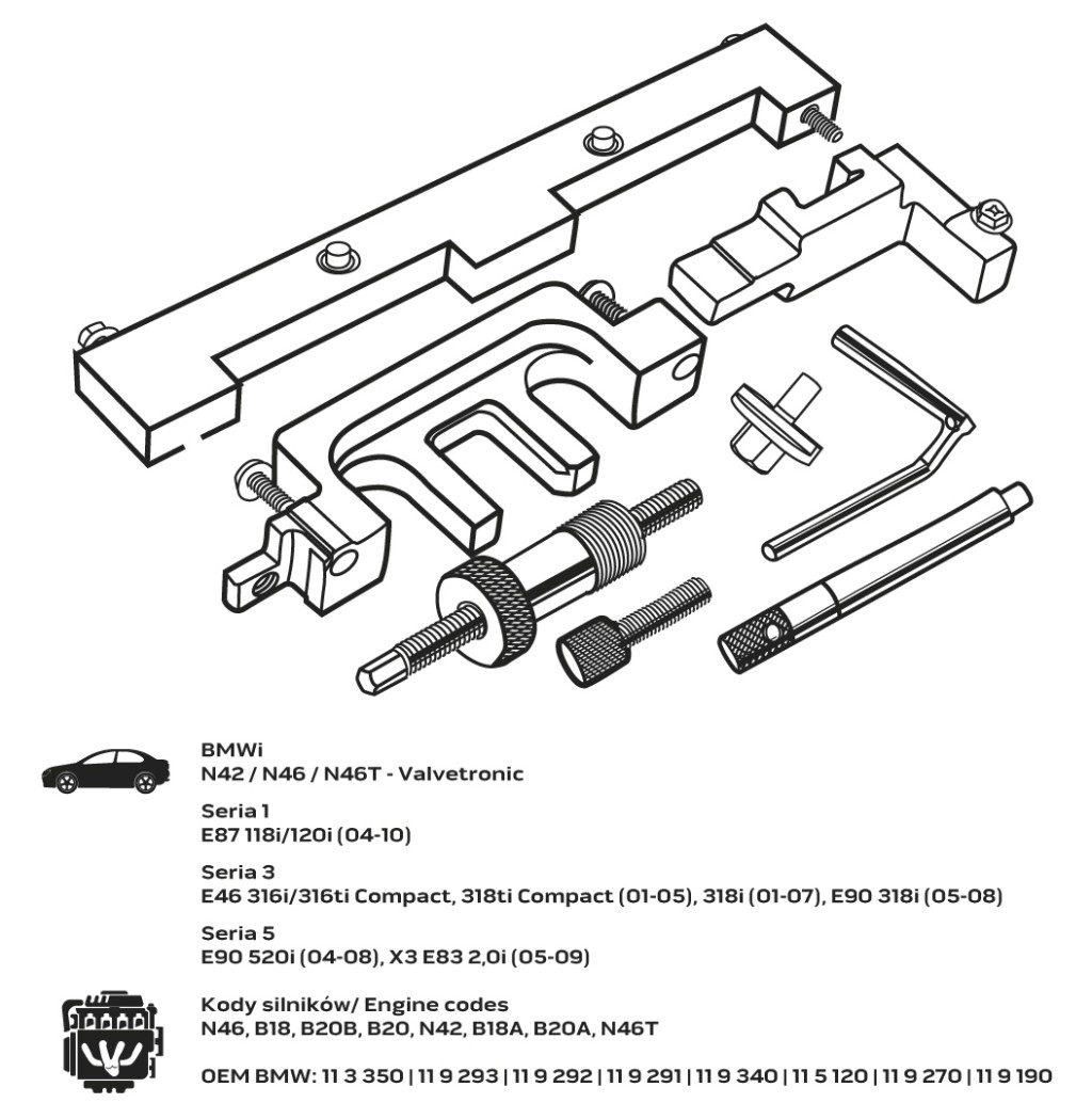 Vezérműtengely-blokkoló készlet BMW Valvetronic-rendszerű benzines motorokhoz, 11-314, NEO TOOLS - vezérműtárcsa-blokkoló készlet BMW autókhoz. A készlet Valvetronic-rendszerű benzinüzemű motorok vezérműtárcsájának blokkolására szolgáló elemeket tartalmaz. Biztosítja a motor beállításához és blokkolásához szükséges alapszerszámokat.