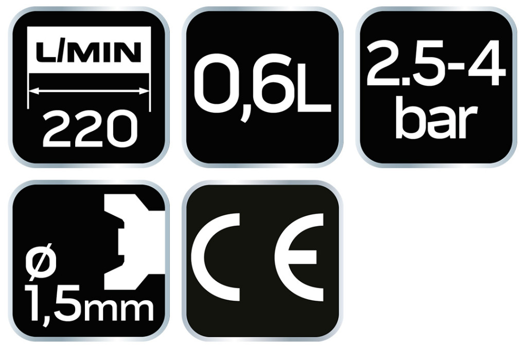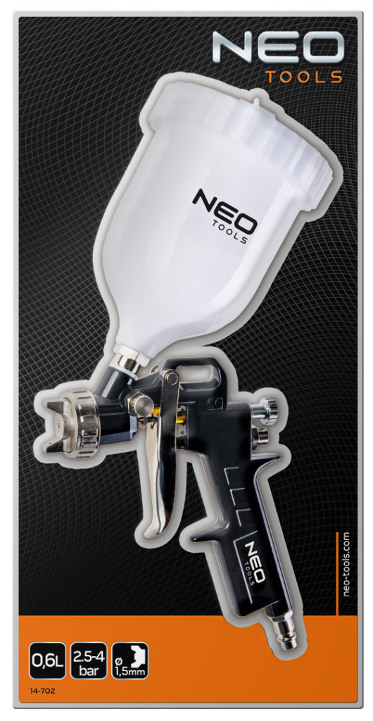 Festékszóró pisztoly, 0,6 literes tartállyal, NEO 14-702, NEO TOOLS - műanyag felső tartállyal. Rozsdamentes acélból készült, 1,5 mm átmérőjű fúvókával van felszerelve. Hatékony és precíz munkavégzést garantál. A berendezés üzemi nyomása 4 bar. Az európai biztonsági szabványoknak való megfelelőséget a CE tanúsítvány igazolja. A NEO márka a professzionális igényeket is kielégíti.
