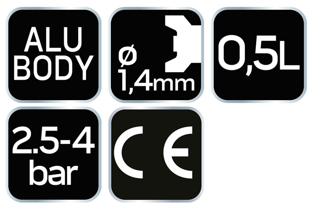 Festékszóró pisztoly, NEO 14-703, NEO TOOLS - 0,5 literes felső tartállyal. Az 1,4 mm átmérőjű fúvókával hatékony és pontos munkavégzés érhető el, továbbá két nyomástartomány állítható, minek köszönhetően a pisztoly teljesítménye a festék és felület típusához igazítható. Maximális üzemi nyomás 4 bar. Az európai biztonsági szabványoknak való megfelelőséget a CE tanúsítvány igazolja. A NEO márka a professzionális igényeket is kielégíti.