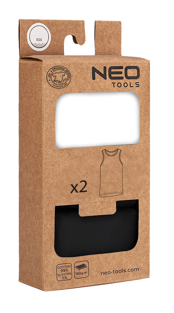 NEO 81-677-XXL Munkavédelmi póló, fekete-fehér, ujjatlan, 95%pamut, 5%elasztán, 2db/cs. Két pólóból álló szett, fekete és fehér praktikus színekben. A kényelmes viseletű, 180 g/m2 súlyú, egyrétegű kötött anyagból (95% pamut, 5% elasztán) készült pólók téli hónapokban alsó ruházatként és magas hőmérsékletre alkalmas nyári ruházatként egyaránt jól használhatóak. A NEO TOOLS pólók a márka egyedi, saját tervezésű sorozatának részét képezik. Kerek nyakkivágással, hónalj- és nyakkivágási szegéllyel, valamint a belső oldalra nyomtatott címkével rendelkeznek. Sokoldalú ruházati opciót jelentenek a mindennapi viselethez. A pólókra jellemző, hogy megfelelnek a CE minősítésnek.